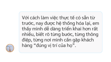 Gặp Hân thì Hân chỉ ra cho mình định vị và cách tiếp cận phù hợp với con người, tính cách, value, nguồn lực của bản thân, làm mình không có cảm giác phải gồng, phải cố, phải bắt chước bất cứ công thức thành công của ai. Mọi thứ trở nên rõ nét hẳn. Điều mình thích là sự rõ ràng, rành mạch, logic: tại sao lại là ý tưởng này, đóng gói sản phẩm thế này, KPI ra sao, và bài toán nguồn lực và vận hành thế nào để đạt được KPI đó.